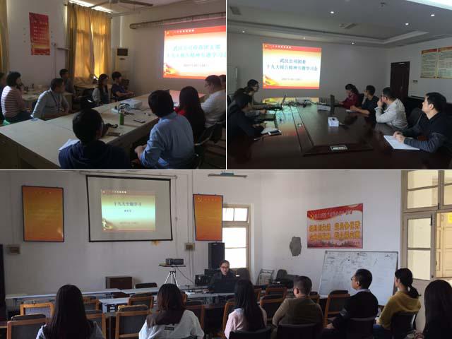 10月24日下午,公司团委组织召开了十九大精神专题学习会,团委委员及各团支部书记参加了学习会。会上,大家深刻学习了习近平代表第十八届中央委员会向党的十九大作的报告,《划重点!习近平报告,这四个新概念很重要》、《全方位解读十九大报告:新提法新举措四十个!》以及人民日报、共产党员网等宣传媒体上关于十九大会议的动态报道等;开展了以“深入学习领会十九大精神,齐心协力促进企业健康发展”为主题,畅谈学习体会,结合武汉公司发展实际和岗位情况,为企业发展献计献策;组织观看了“砥砺奋进的五年大型成就展网上展馆”视频。团委书记要求各支部积极组织支部团员青年开展十九大精神的学习、交流讨论。